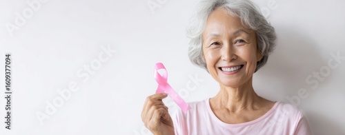 The smiling elderly woman holding a pink ribbon for cancer awareness