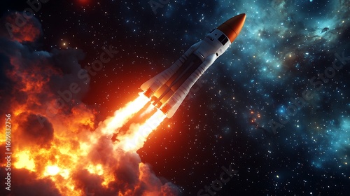 Rocket ship ascends through fiery clouds into the vast and starry cosmic universe photo