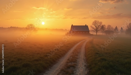 Golden sunrise illuminates a misty countryside farm. A winding dirt road leads to a secluded farmhouse through fields. Peaceful morning haze creates a serene, picturesque atmosphere.
