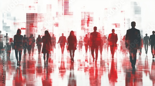 Urban crowd, blurred silhouettes, walking forward