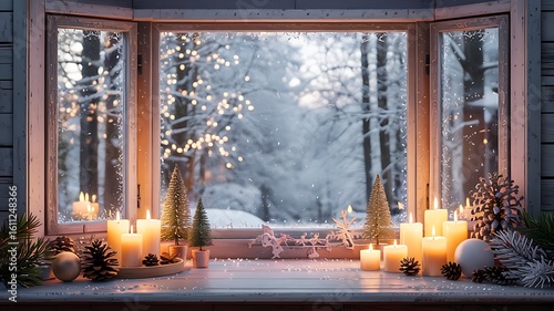 Cozy winter scene viewed through a bay window adorned with glowing candles and festive christmas decorations on a snowy day