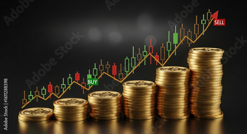 Ascending gold coin stacks with superimposed upward trending candlestick chart, symbolizing financial growth and investment success