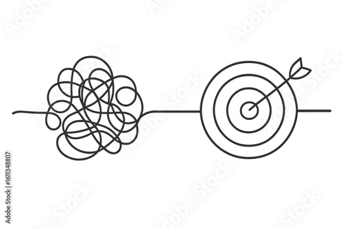 Continuous one line drawing of chaotic tangled scribble morphing into bullseye target with arrow, metaphor of problem solving, goal achievement, planning, brainstorming concept
