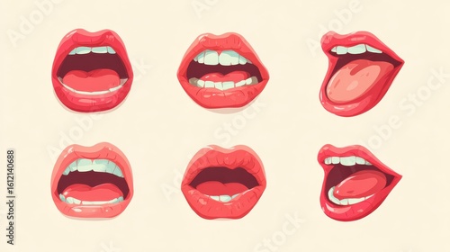 Cartoon character mouth and lips sync for sound pronunciation. Vector set animation frames. Teaching talk letters illustration, no logos, no brands