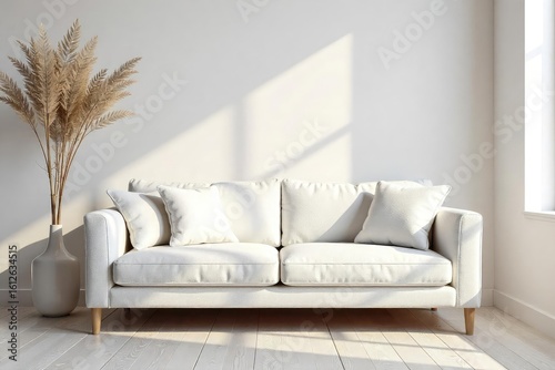 Cozy domestic white interior scene featuring a plush white sofa, soft lighting, and fluffy white cushions Perfect for home decor, interior design, and lifestyle concepts , texture, style, serene