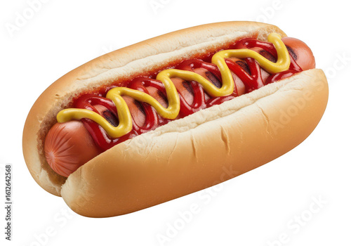 Plump hot dog with ketchup and mustard in a bun on hotdog sausage