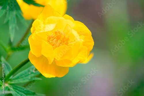 Blooming yellow bud of European globeflower, a tall, unpretentious perennial plant.