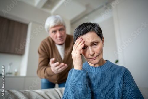 Senior upset despair woman with head in ahnds enduring verbal aggression and accusation from unstable partner in dysfunctional relationship. Psychological control, silent suffering, abuse manipulation