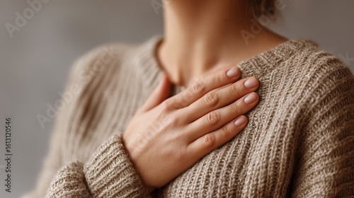 Person gently patting chest with hand, expressing empathy and care, close-up gesture, soft neutral background