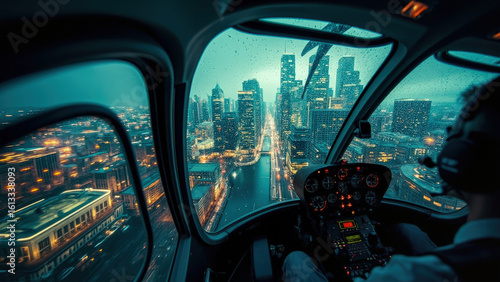 Helicopter cockpit view of a city skyline at night with rain drops on the windshield and pilot in the seat