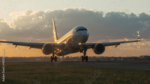 Airplane landing at sunset, wheels down, approaching runway.