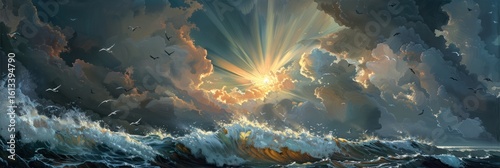 Dramatic seascape with stormy sky and sunrise