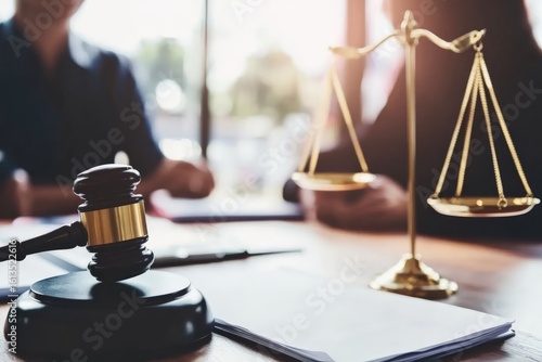 Judge's gavel and scales of justice resting on a wooden desk during a court hearing