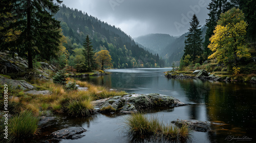 Black lake in the centre of forest , mountain background , dark mood.
