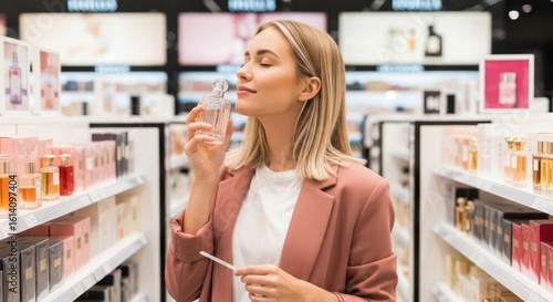 Woman is smelling a perfume bottle in a store with shelves of fragrances