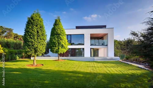 modern white house landscaped garden green trees sunny day architectural design