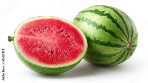 A fresh watermelon sits on a white surface, with one half cut open revealing juicy, red flesh. Perfect for summer gatherings, fruit salads, or refreshing snacks.