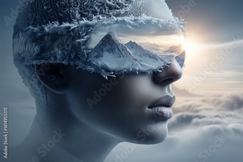 A serene face with closed eyes has a mountain landscape superimposed on it. The blending of natural scenery with the human form creates a peaceful and dreamlike image.