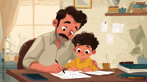 Father assists his child with homework in cozy, well lit room filled with books and plants. scene captures warm, nurturing moment of learning and connection