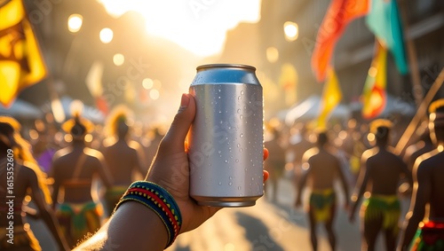 Hand holds aluminum can at vibrant outdoor festival with sun flare