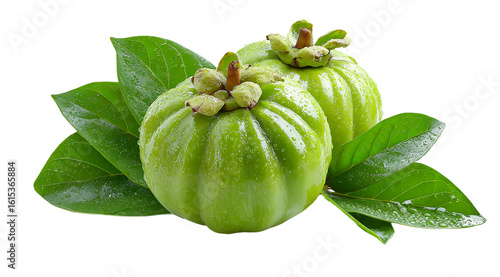 Two green garcinia cambogia fruits with leaves on a isolated on transparent background