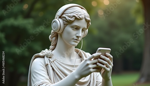 Klassische Statue mit Kopfhörern und Smartphone in moderner Inszenierung
