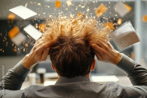 A person with messy hair holds their head in frustration as papers fly wildly around them in a chaotic office setting.