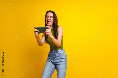 Joyful young woman playing a smartphone game on a bright yellow background, capturing a dynamic and entertaining moment