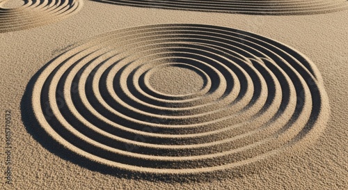 Concentric raked patterns in fine sand create a serene, minimalist design, resembling a Japanese Zen garden with precise circular symmetry.