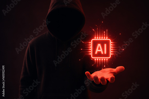 Mysterious hacker holding glowing red artificial intelligence microchip showing potential dark web cybersecurity threats and risks of unethical ai usage and data breach