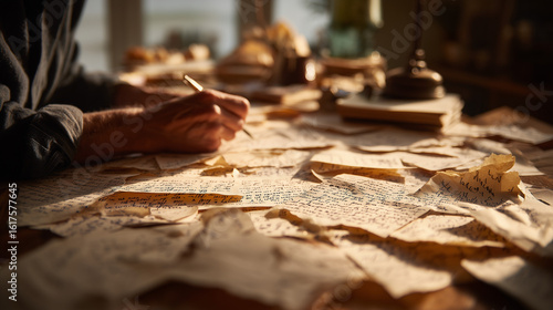 A writer's hands organizing chaotic handwritten notes into a coherent story, representing the creation of a narrative from raw ideas.