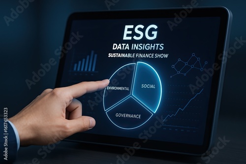 sustainable finance show highlights eco-conscious investment strategies. A hand interacts with a tablet displaying an ESG data insights dashboard