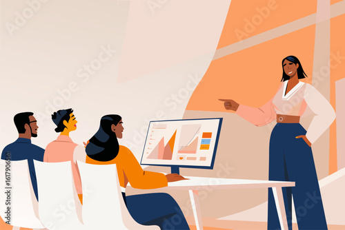 Liderka prowadzi prezentację biznesową, omawiając strategię i analizę danych. Ilustracja symbolizująca przywództwo, pracę zespołową i sukces.