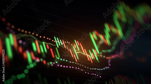 Financial Fluctuations: A mesmerizing close-up captures the volatile dance of market indicators, showcasing the dynamic patterns of financial trading in vibrant colors and complex graphical display.
