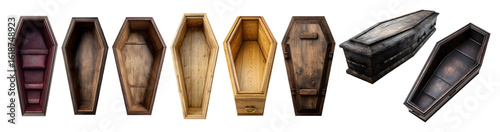 Set of empty opened wooden coffins for Halloween, isolated on transparent background.