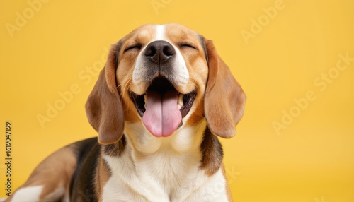 Happy beagle dog lies on yellow background, smiling with eyes closed, tongue out. Adorable puppy expresses pure joy, relaxation. This cheerful pet portrait captures moment of bliss, contentment.