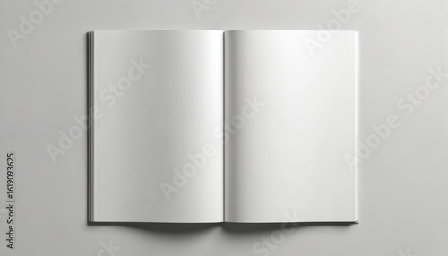 Opened blank catalog mockup on white paper background. Features clean empty pages perfect for graphic design projects. Ideal for product catalogs, magazines, portfolios with ample copy space.