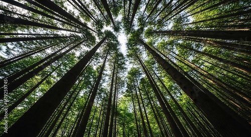A worms-eye view looking up at a dense canopy of tall, green forest trees.