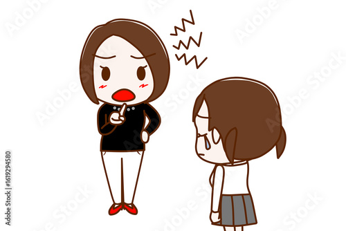 (複数)ガミガミと注意をする女性としょんぼりして涙を流す女子学生