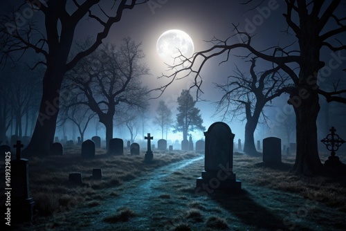 A spooky cemetery at night under a full moon with eerie fog and bare trees