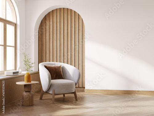 MInimal and warm living room interior with Serene Corner with Natural Light, wooden floors, and an armchair against warm white walls.3d render