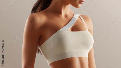 Woman wearing white asymmetrical sports bra showing toned shoulder and upper body with smooth skin in studio light