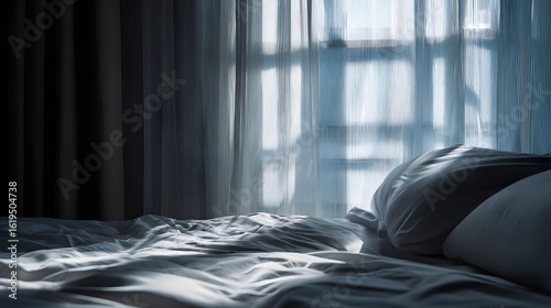 Stylish hotel room with crisp linens and morning sunlight filtering through sheer curtains.