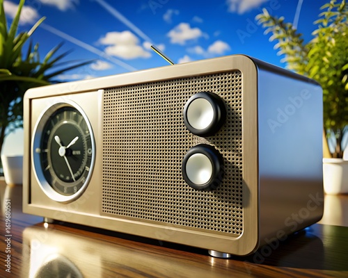 Retro-style radio with twin dials and speaker mesh, placed outdoors under a bright sky with plants in background. Radio de estilo retro con dos diales y rejilla de altavoz, colocada al aire libre bajo