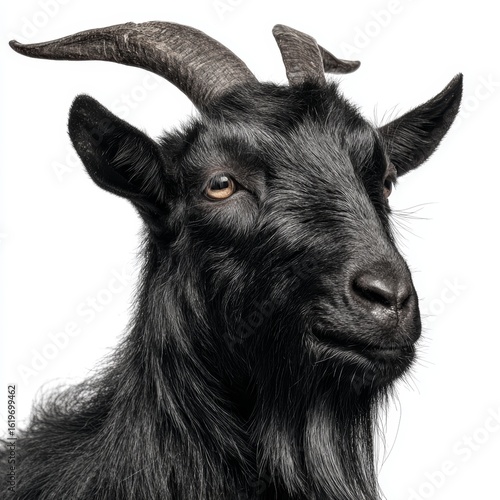A close-up of a black goat with majestic horns. The goat has a full coat of black fur and intense eye