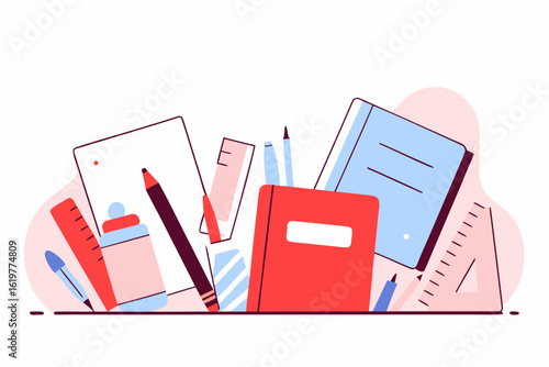 Zestaw przyborów szkolnych i biurowych. Tło edukacyjne symbolizujące powrót do szkoły i naukę.