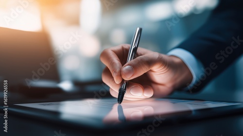 オフィスでデジタルタブレットにペンで書き込むビジネスパーソンの手元 | Hand of a business person writing on a digital tablet with a pen in an office