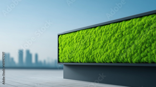 A modern urban landscape featuring a vibrant green moss or plant wall embedded in a sleek dark gray planter, set against a bright blue sky. In the softly blurred background, a silhouette of a city sky