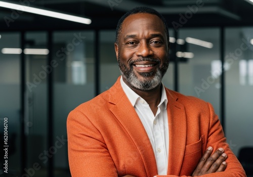 Confident african american businessman with salt and pepper beard wearing a vibrant orange blazer in a modern office setting