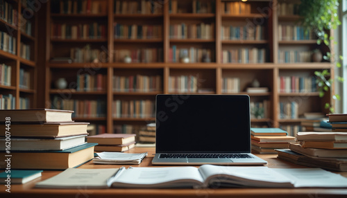 Desk with open laptop, stacked books, and papers in a library study space. Bookshelves filled with volumes create a backdrop for learning, research, and focused work.